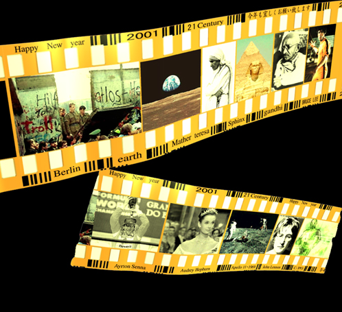 | 『20世紀の終わり』 2001年度年賀状の素材です。フィルムの曲線を再現するため、フィルム部分を3DCGにて製作。新世紀に向けて20世紀の出来事をフィルムの中に入れました。 写真点数も限られ、年賀状という事もあり、デザインしやすく、なるべく当たり障りのない誰でもわかりやすい出来事の写真を使用しました。スフィンクスと ピラミッドは21世紀には、さまざまな謎が解明されるかもと言う希望から入ってます。・・・ |